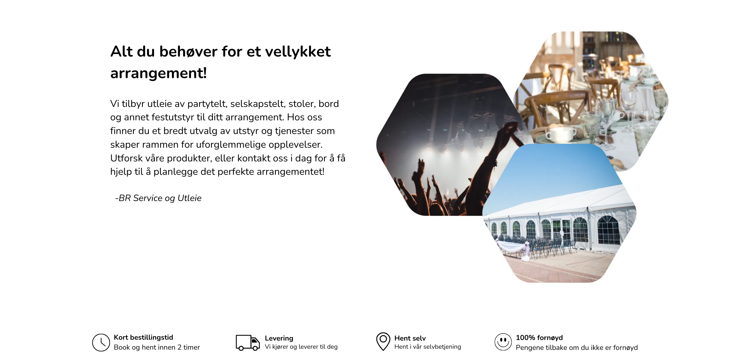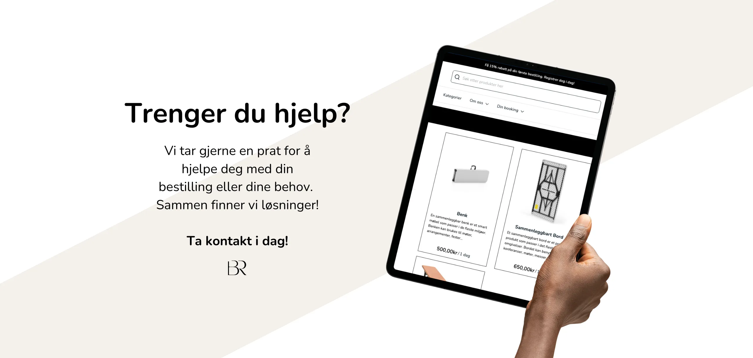 Vi gjør det enkelt for deg! Hos oss finner du alt du trenger for å arrangere et vellykket selskap – fra telt, bord og stoler til mye mer. Vi tilbyr en komplett løsning på ett sted, og kan også sørge for levering og montering, slik at du kan fokusere på å nyte arrangementet.